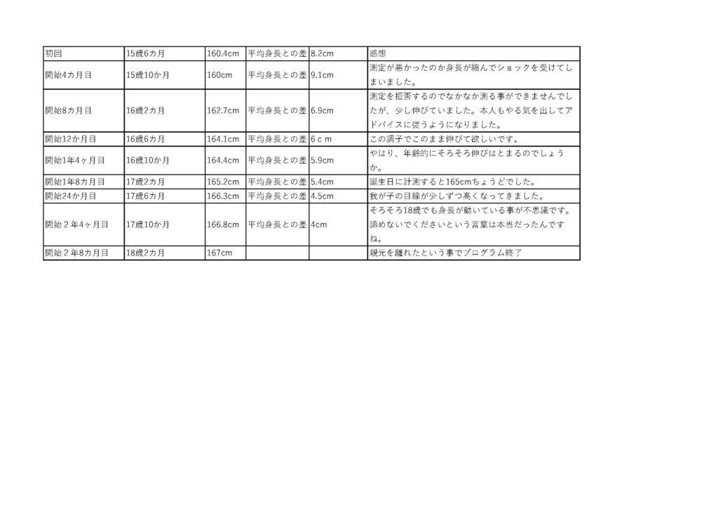もっと早く出会えていたら、もっと伸びたかもしれないと思う部分もありますが、165cmを超える事ができ感謝しています。